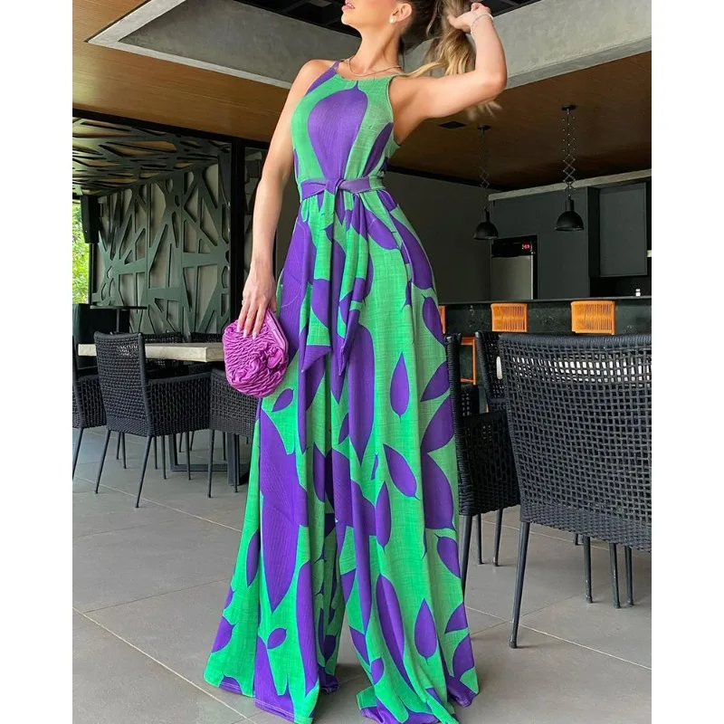 Женский комбинезон с завышенной талией, Фиолетовый комбинезон без рукавов с принтом на лямках, весна 2024