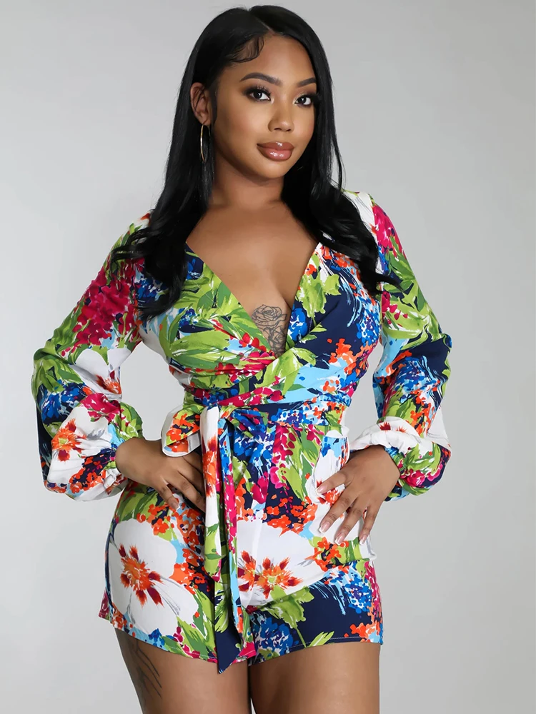 Женский комбинезон с цветочным принтом, с V-образным вырезом и длинным рукавом