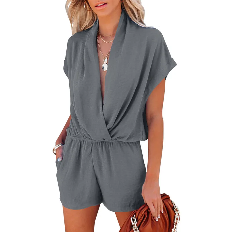 Женский комбинезон с V-образным вырезом, с коротким рукавом и поясом на резинке