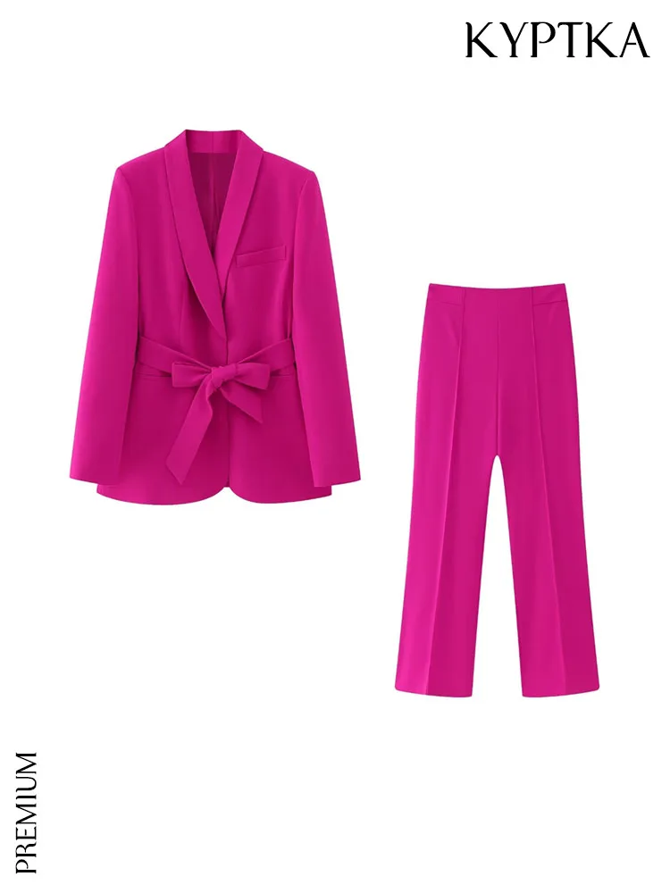Женский комплект из блейзера и брюк KYPTKA, черный комплект из двух предметов, блейзер с поясом и скрытыми пуговицами спереди и брюки с высокой ...