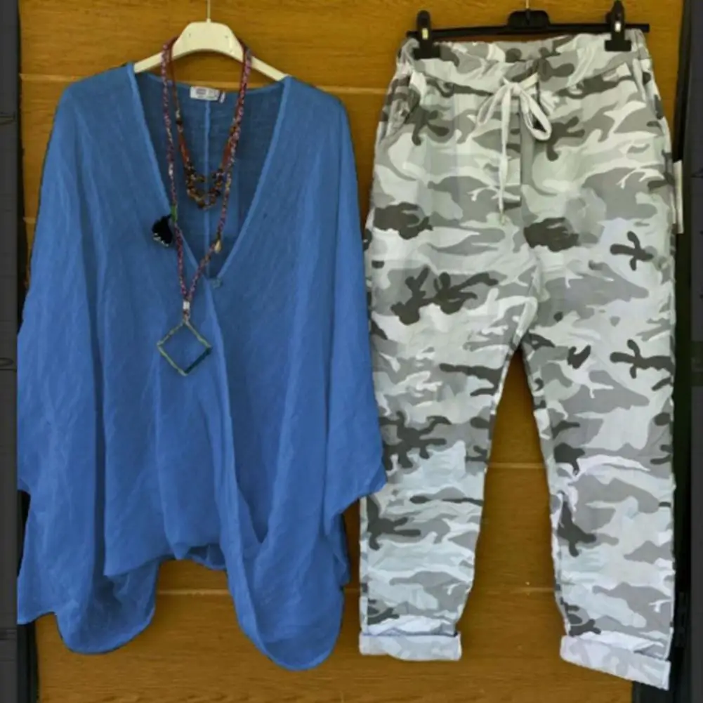 Женский комплект из блузки и брюк, повседневный Камуфляжный топ с коротким рукавом «летучая мышь» и камуфляжные брюки для отдыха, 1 комплект, на лето