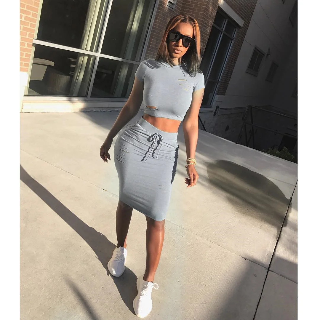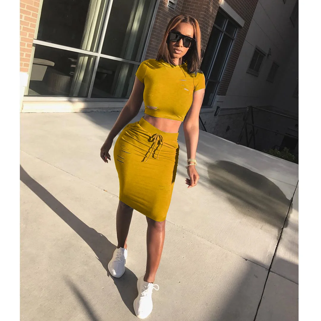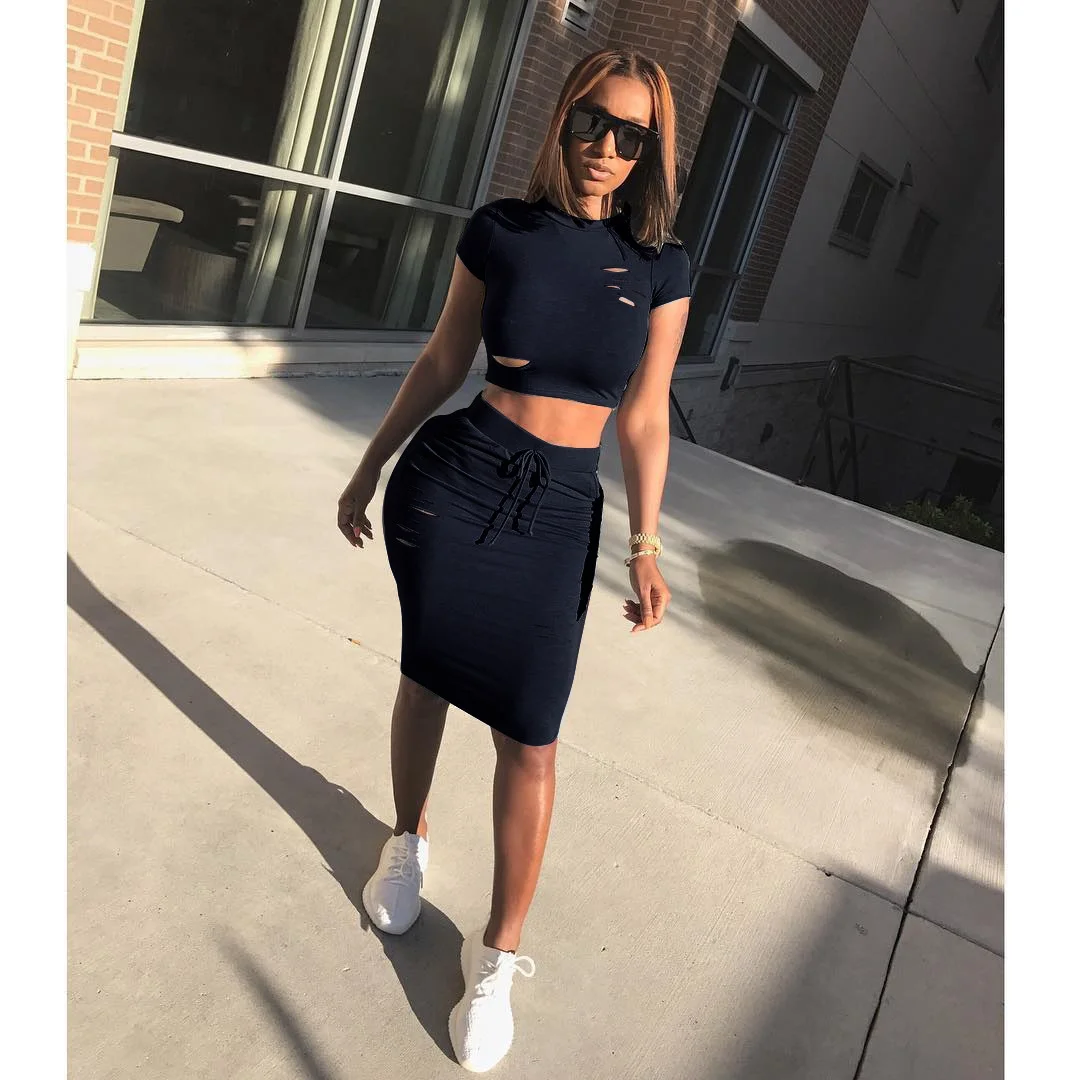 Женский комплект из двух предметов, однотонная Сексуальная футболка с дырками и юбка, летний комплект из двух предметов