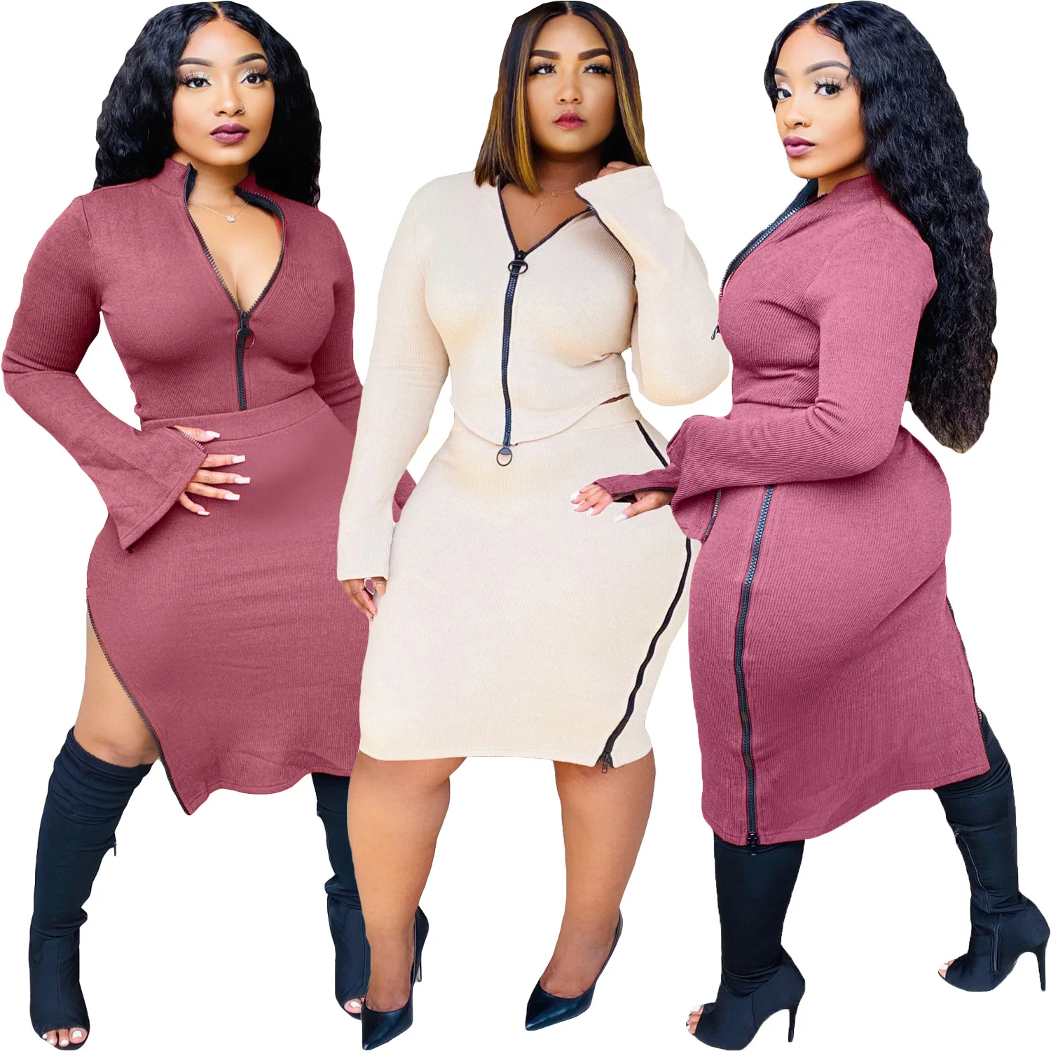 Женский комплект из двух предметов, однотонный облегающий Топ с длинным рукавом и юбка с двойной молнией, лето 2021
