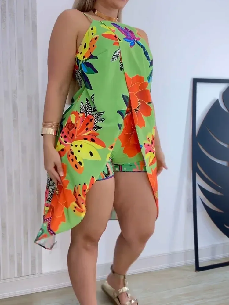 Женский комплект из двух предметов с цветочным принтом, асимметричное платье на бретелях-спагетти с разрезом и шорты, повседневный летний комплект для отпуска