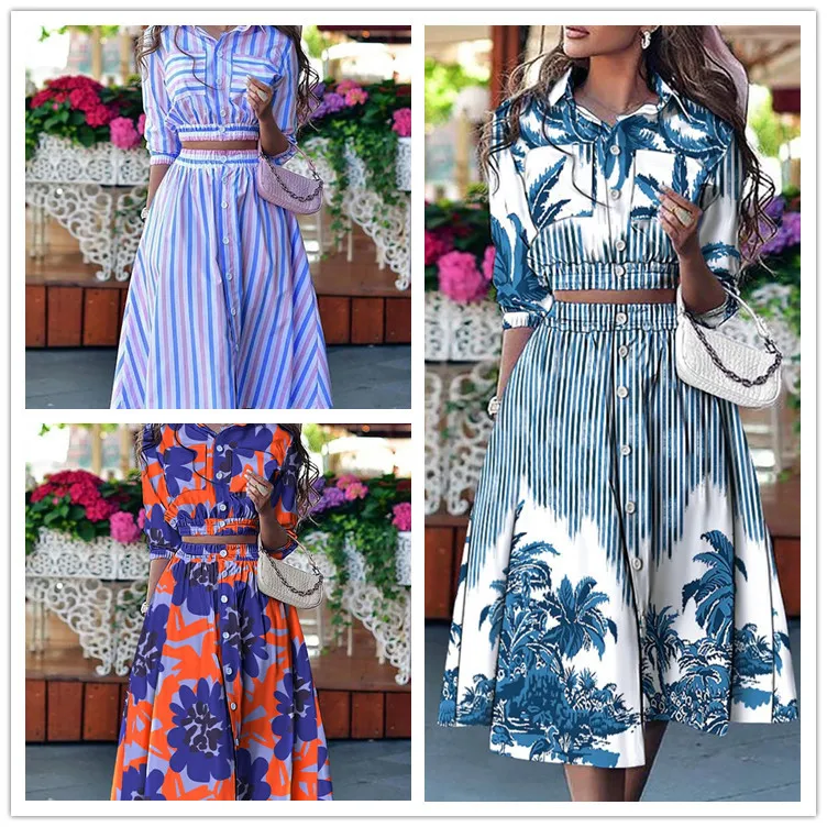 Женский комплект из 2 предметов, элегантный летний женский топ с воротником-стойкой и юбка с широкой юбкой, 2023