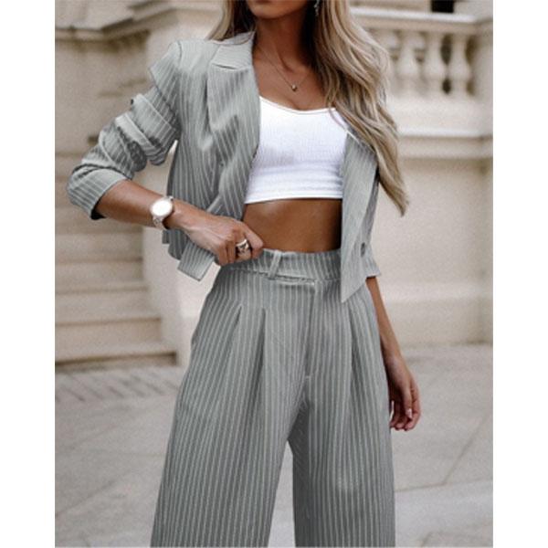 Женский комплект пальто и брюк OL для поездок на работу, формальный стиль, отложной воротник, куртка с длинным рукавом, брюки с высокой талией, в полоску, с широкими штанинами, комплект, женский деловой наряд S серый