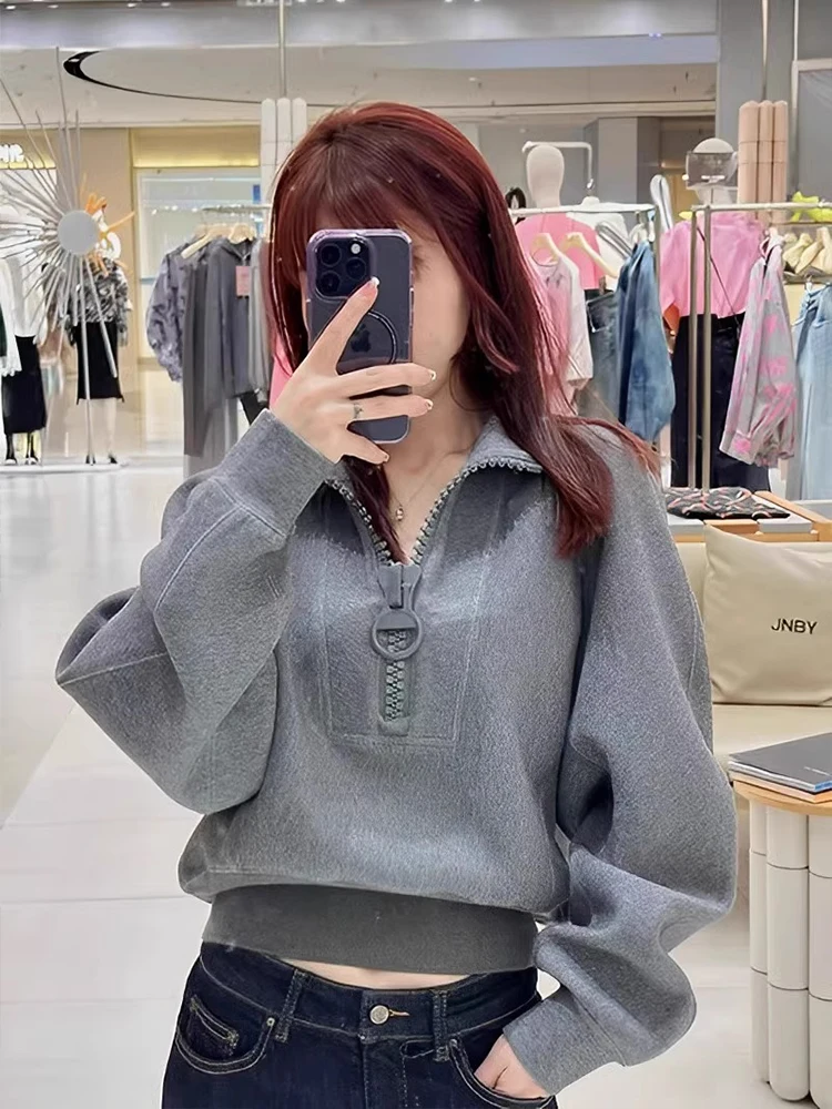 Женский короткий свитер на молнии, Серый Повседневный свитер с воротником-стойкой, осень 2023