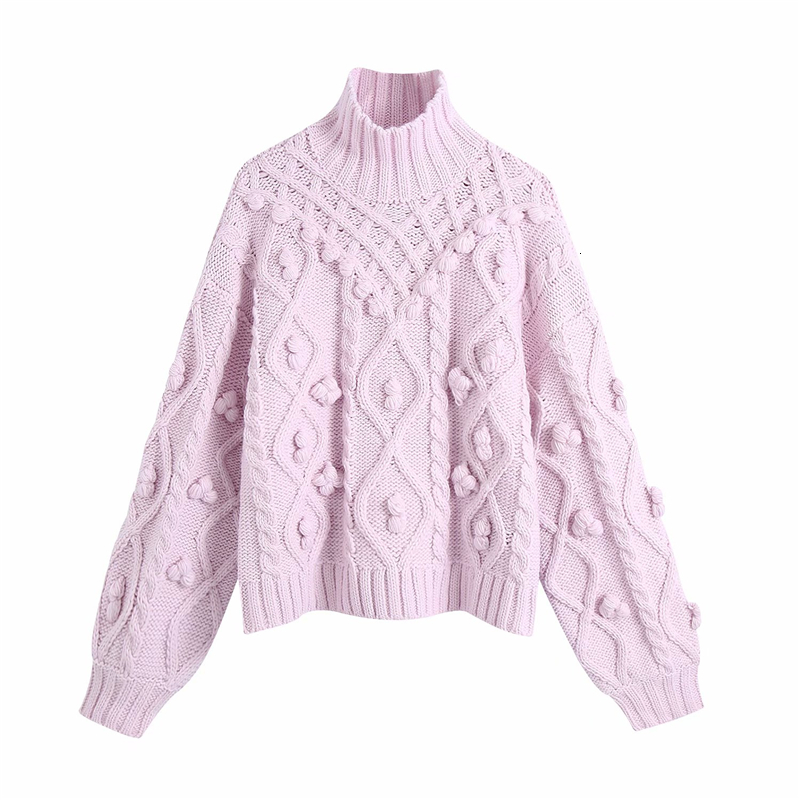 2021 New Doce Bola Decorao Camisola Moda Senhoras Rosa Applique Malha Tops Streetwear Feminino Elegante Gola Alta Pulver 32kd, Pink