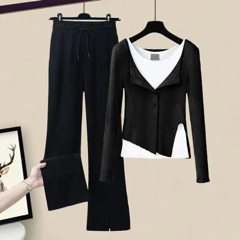 Женский костюм весна-осень Серый поддельный двухкомпонентный блузка, нижняя рубашка, повседневные брюки с разрезом, костюм-тройка для женщин S чёрный