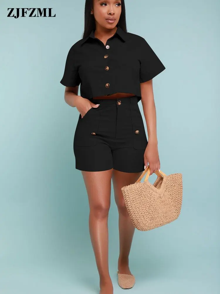 Женский костюм-двойка с отложным воротником, коротким рукавом и пуговицами