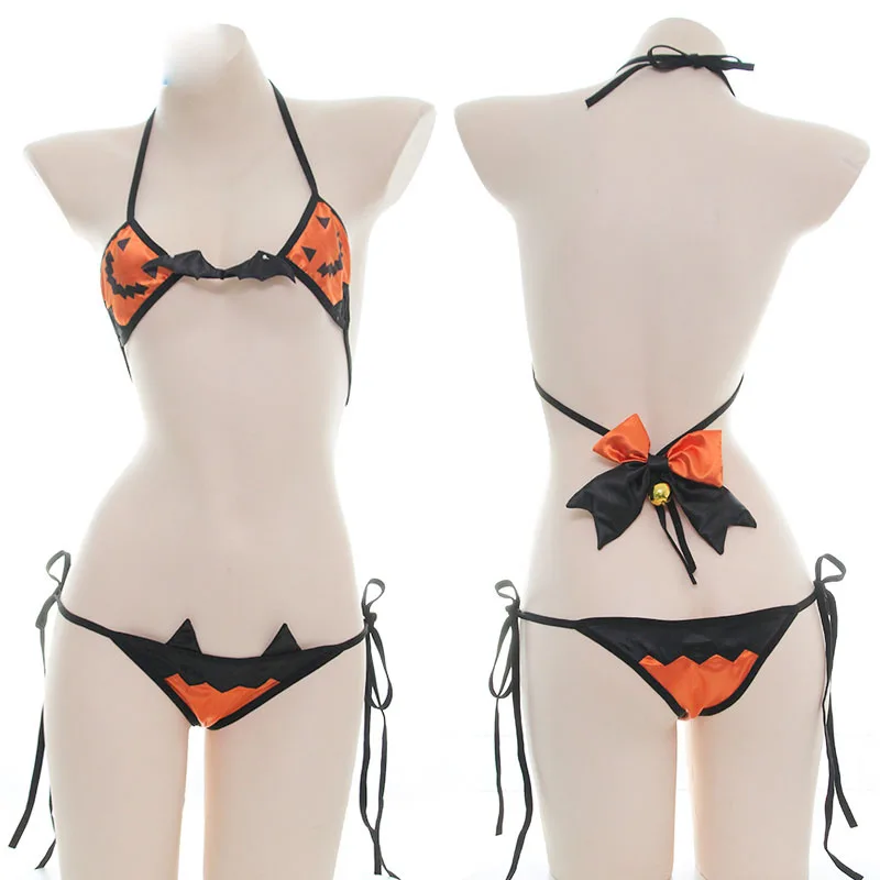 Женский костюм для косплея, сексуальный костюм бикини с лямкой на шее, кавайный бандажный пижамный комплект с колокольчиком, тыквой, дьявол...