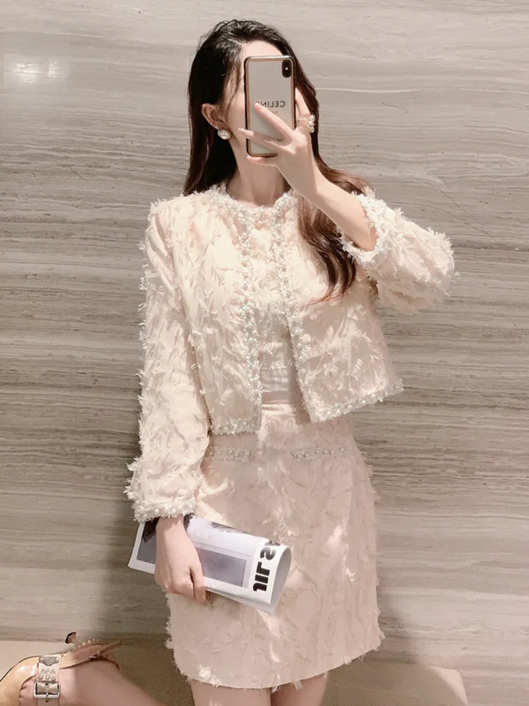 Женский костюм из 2 предметов, короткое пальто с бисером и облегающее мини-платье без рукавов с зауженной талией, осенняя одежда