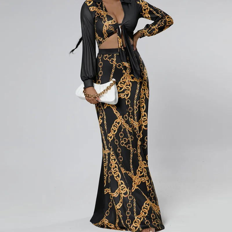 Женский костюм на весну и лето 2023, Привлекательный Топ с V-образным вырезом и длинными рукавами, эластичная юбка с цепочкой