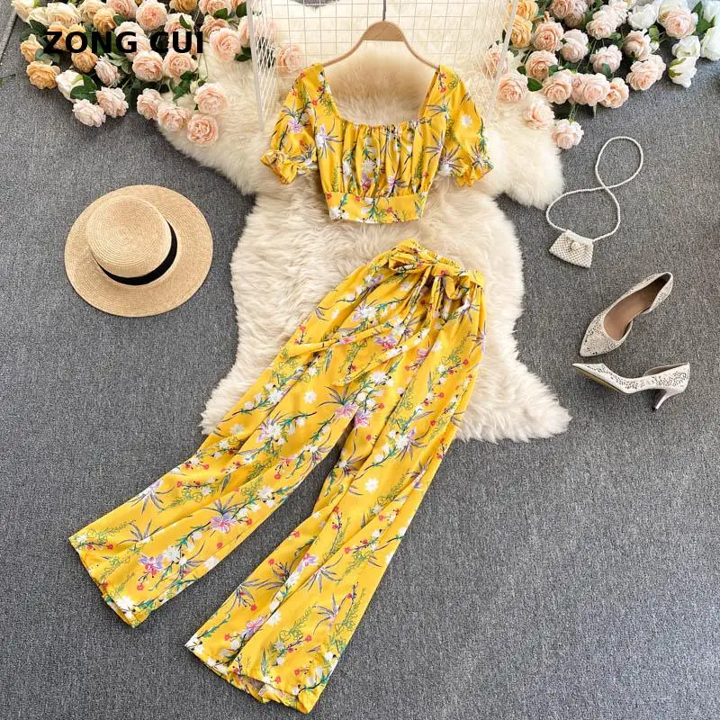 Женский костюм с цветочным принтом в богемном стиле, летний женский топ и широкие брюки с высокой талией, Модный комплект из 2 предметов для ...