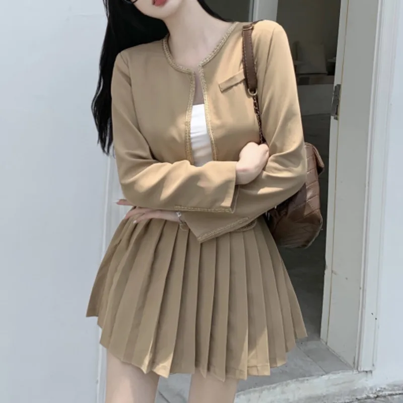 Женский костюм-тройка, короткий пиджак с длинным рукавом, белая юбка на подтяжках и плиссированная юбка с высокой талией
