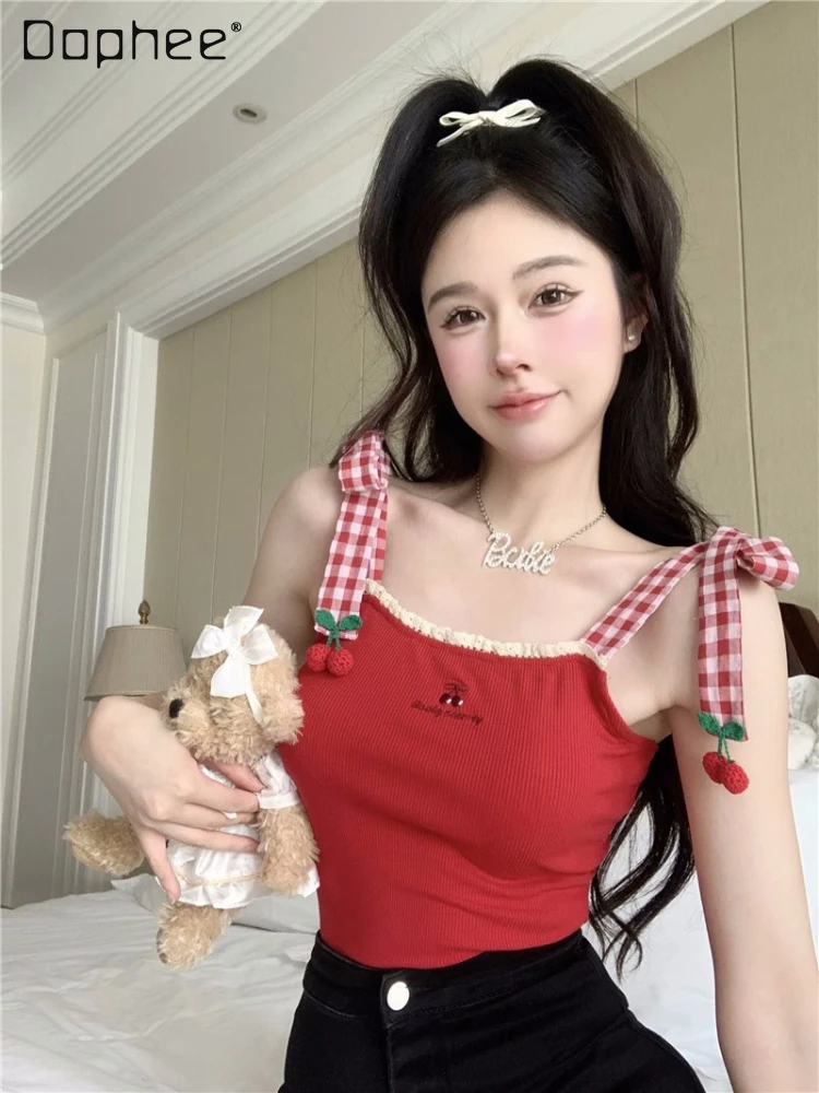 Женский кружевной жилет на бретельках, привлекательный красный жилет с вышивкой, облегающая верхняя одежда в клетку, лето 2023