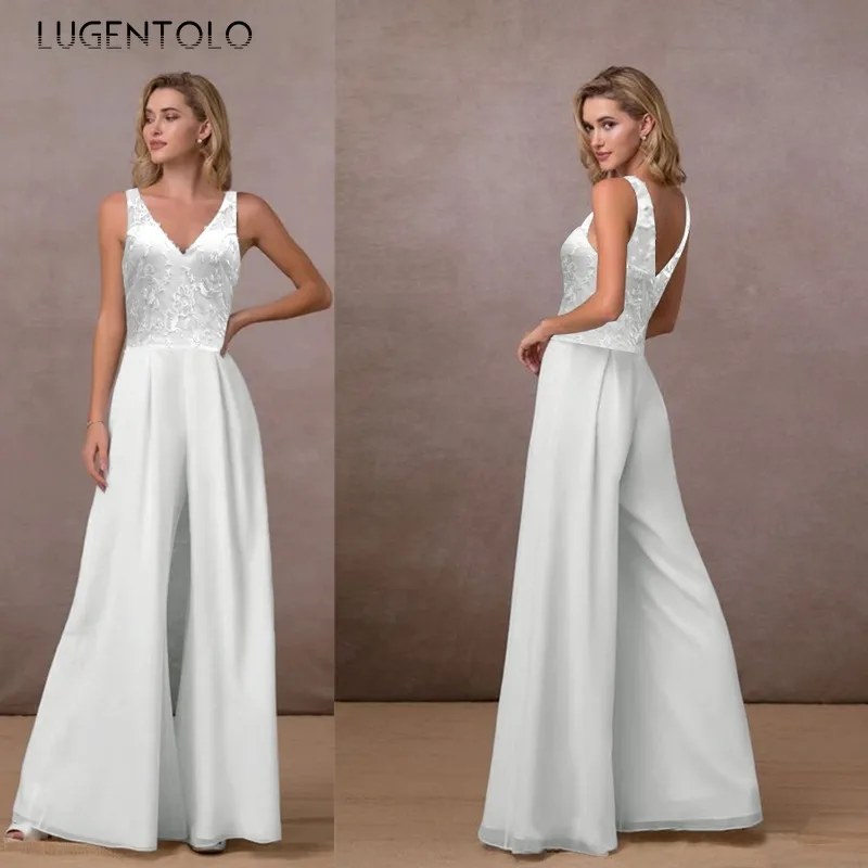 Женский кружевной комбинезон Lugentolo, шифоновый комбинезон с V-образным вырезом, открытой спиной и высокой талией, элегантный комбинезон с широкими штанинами для весны и лета