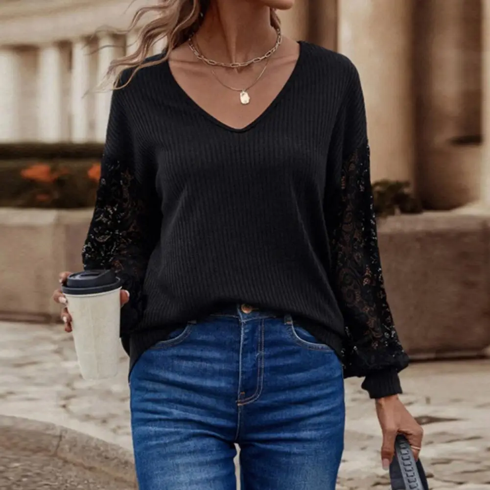 Женский кружевной пуловер с V-образным вырезом и длинным рукавом