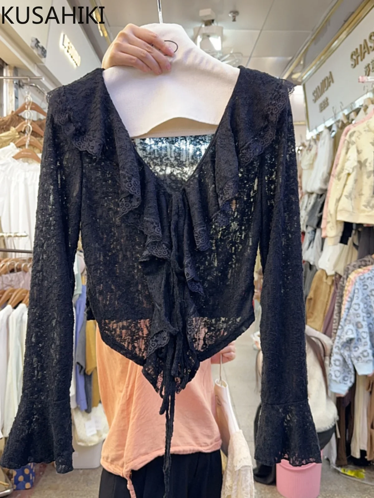 Женский кружевной топ с V-образным вырезом и расклешенными рукавами