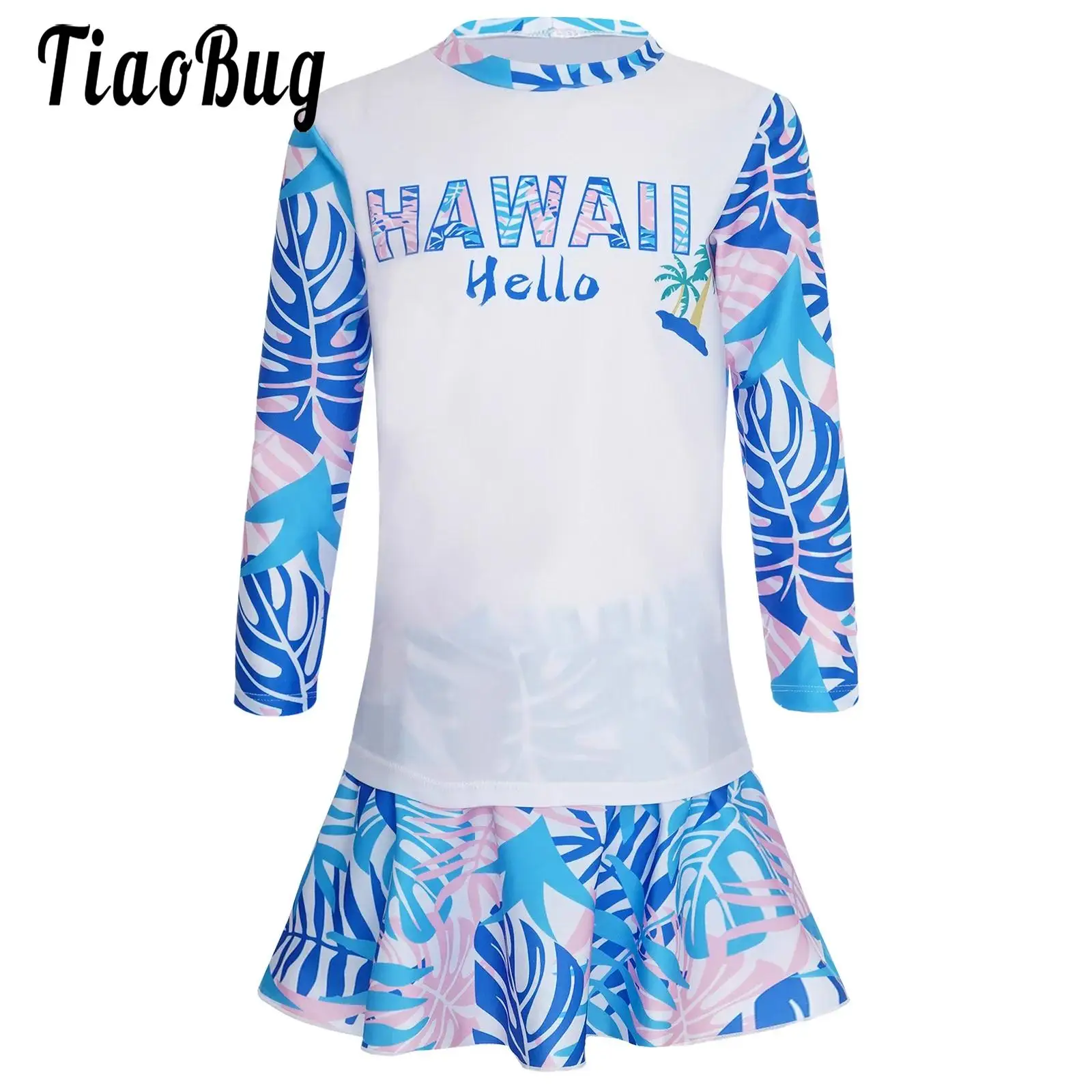 Big Girls Rash Guard Swimsuit Swimwear Tropical Print Long Sleeve Shirts And Swim Shorts Skirts Set Beach Bathing Suit for 4-14Y