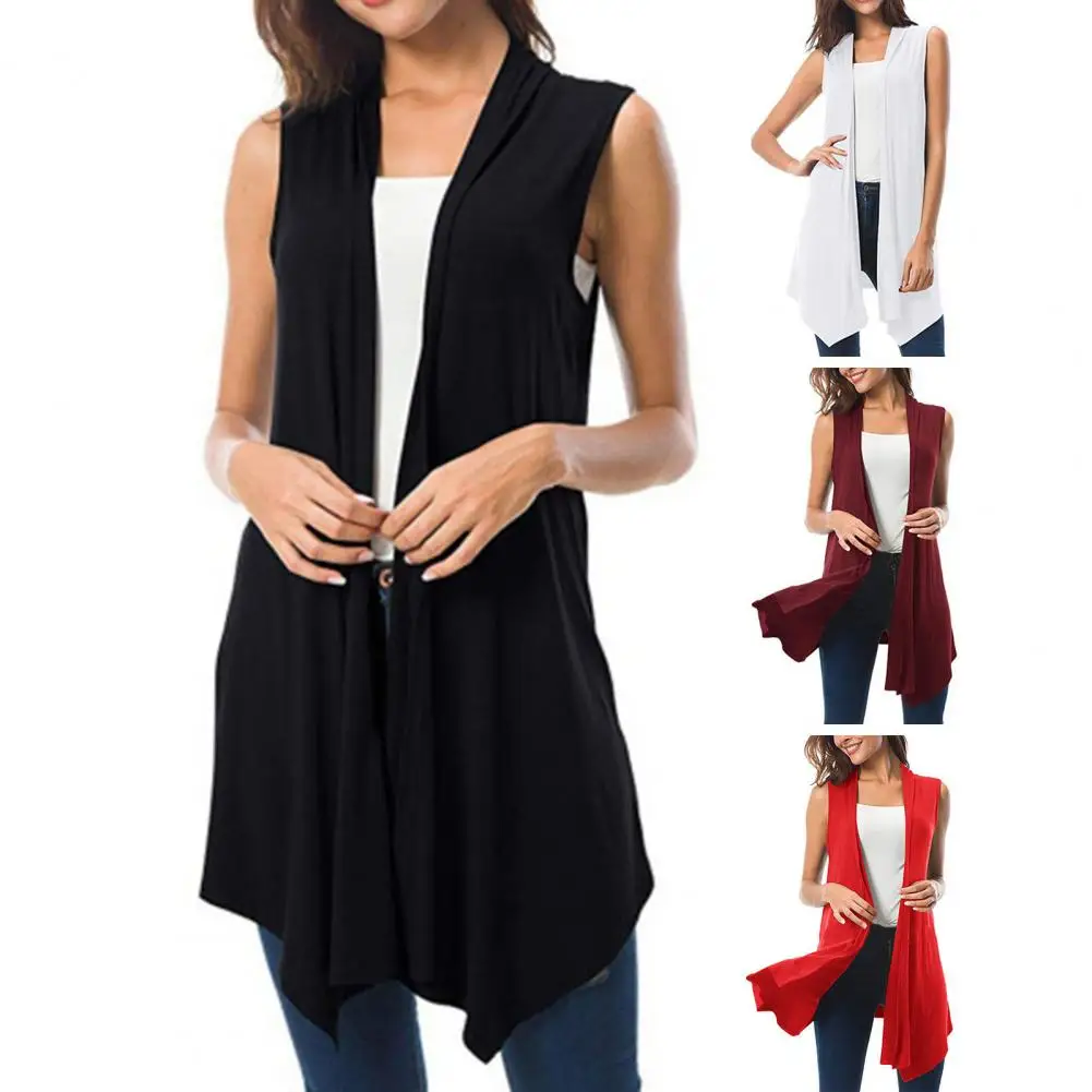 Женский легкий кардиган средней длины без рукавов с асимметричным подолом