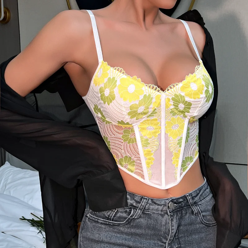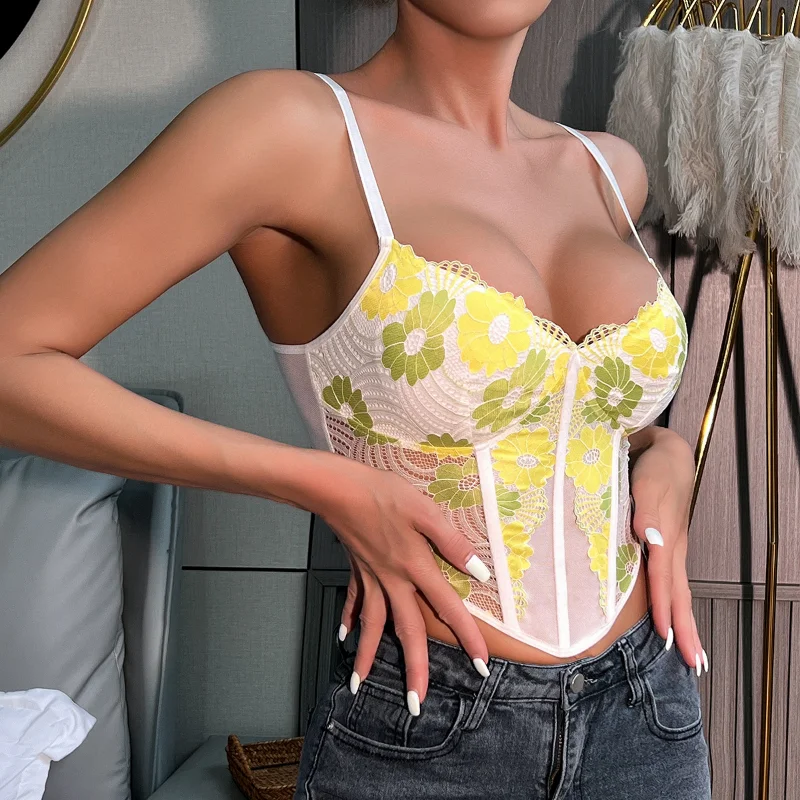 Женский летний ажурный жилет с цветочным принтом и глубоким V-образным вырезом