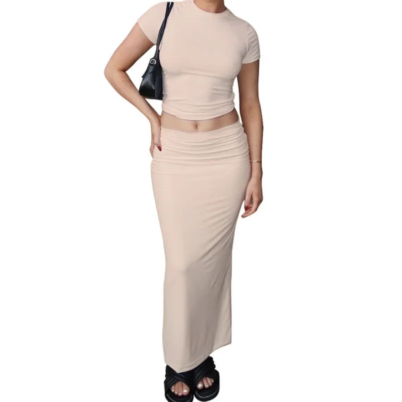 Женский летний комплект из двух предметов, облегающий кроп-топ и длинная юбка, модель H118, 2023