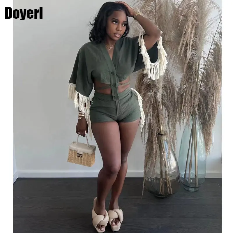 Женский летний комплект из 2 предметов, короткий комплект из двух предметов с кисточками, полурукавами и пуговицами