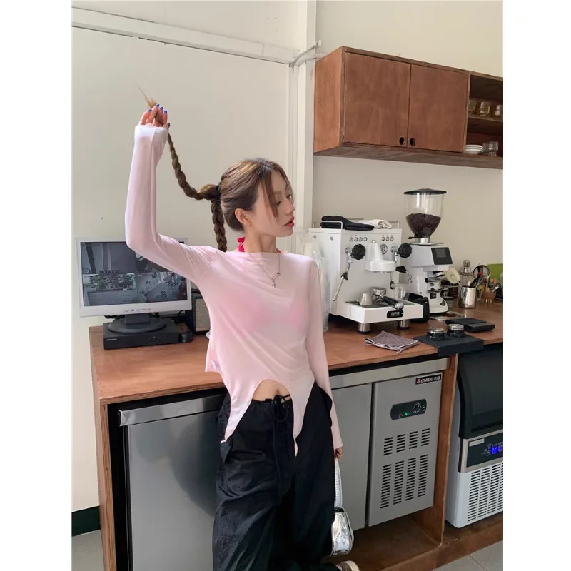 Modern Lady Slim Fit Solid High Neck T-shirt Autumn Women Long Sleeve Female Thumb Holes T shirt Top