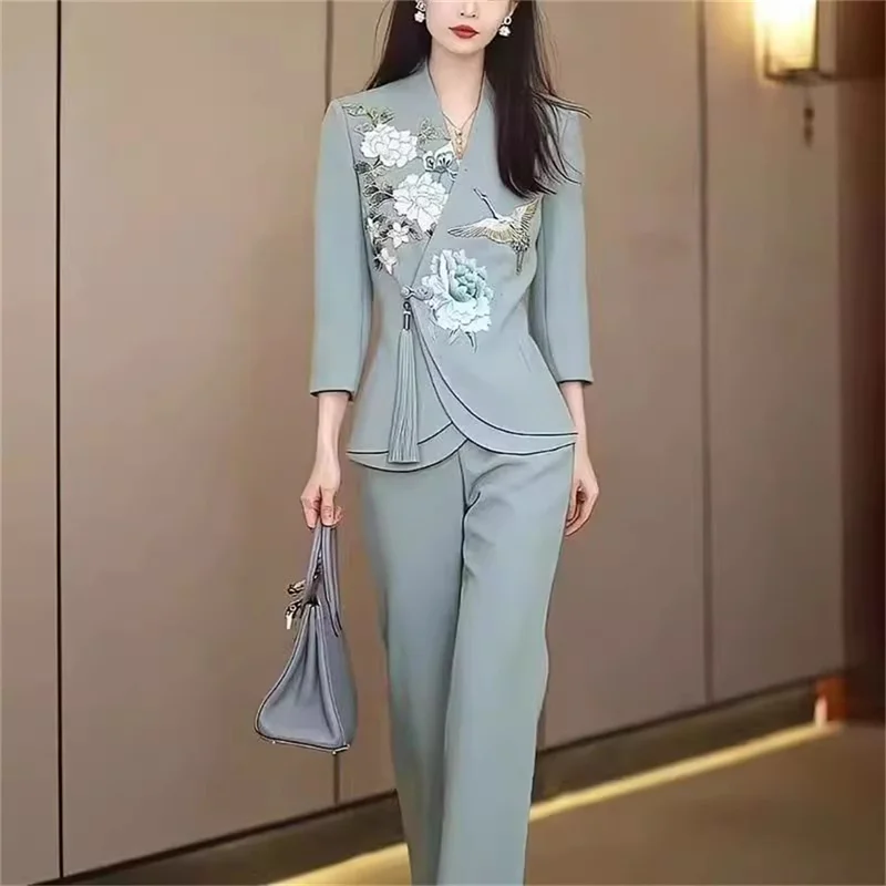Женский летний костюм-двойка с вышивкой и рукавом 3/4