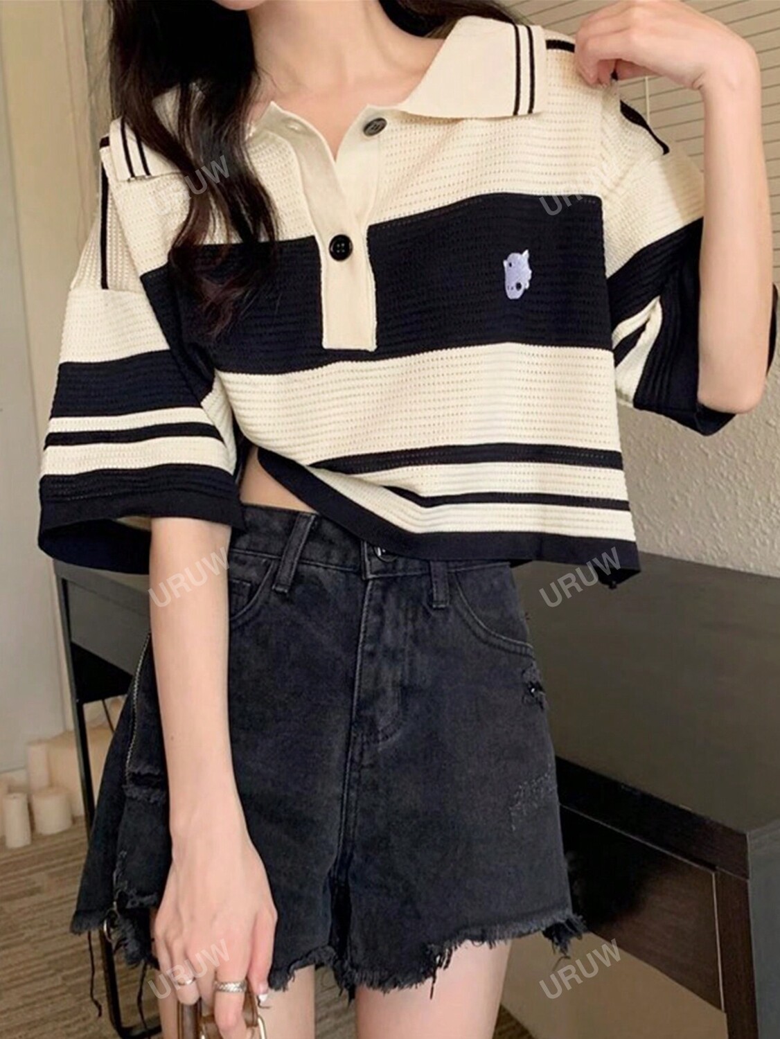 Женский летний повседневный вязаный топ с воротником-поло, свободный крой с заниженными плечами, цветными блоками, топ, абрикосовый