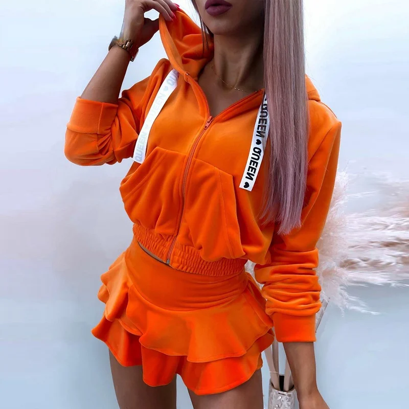 Женский модный костюм, новинка 2021 года, толстовка с длинным рукавом и надписью с карманами и короткая юбка, костюм, рок-костюм