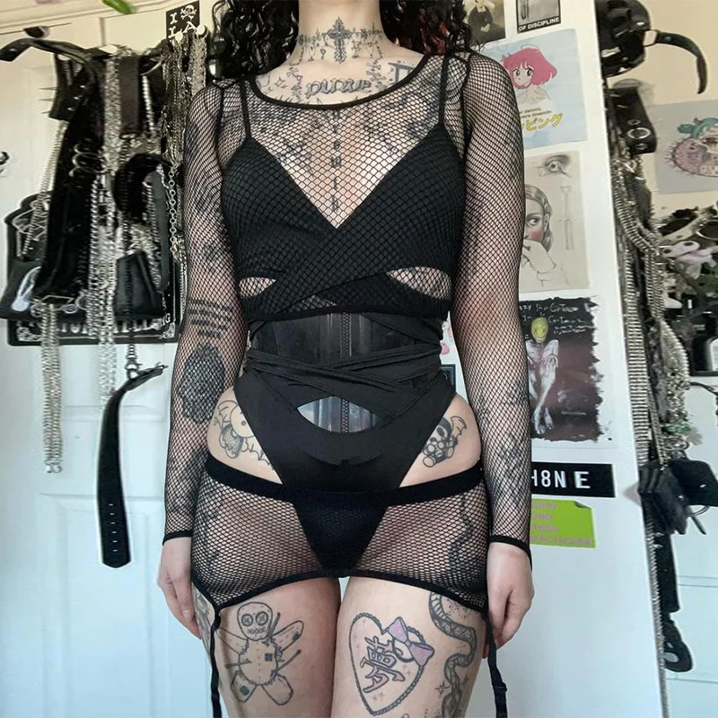 Женский облегающий комбидресс Goth Dark, однотонный Готический комбидресс с перекрестными лямками и вырезами,
