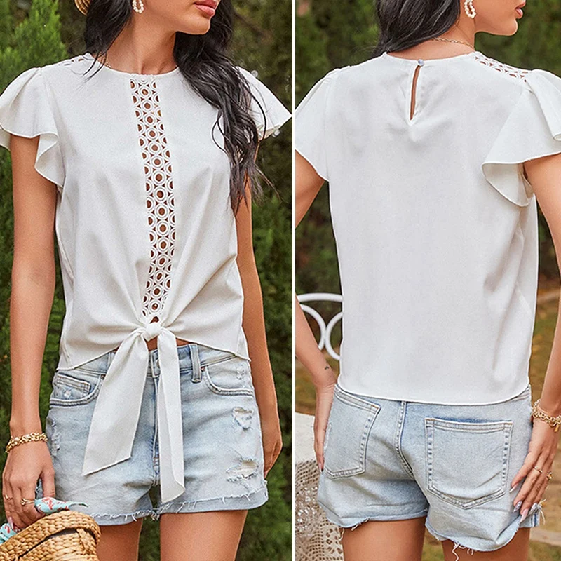 Женский облегающий однотонный топ с круглым вырезом и оборками на рукавах