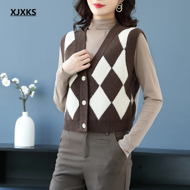 Женский однобортный короткий жилет XJXKS, шерстяной кардиган без рукавов с V-образным вырезом, весна-осень 2022