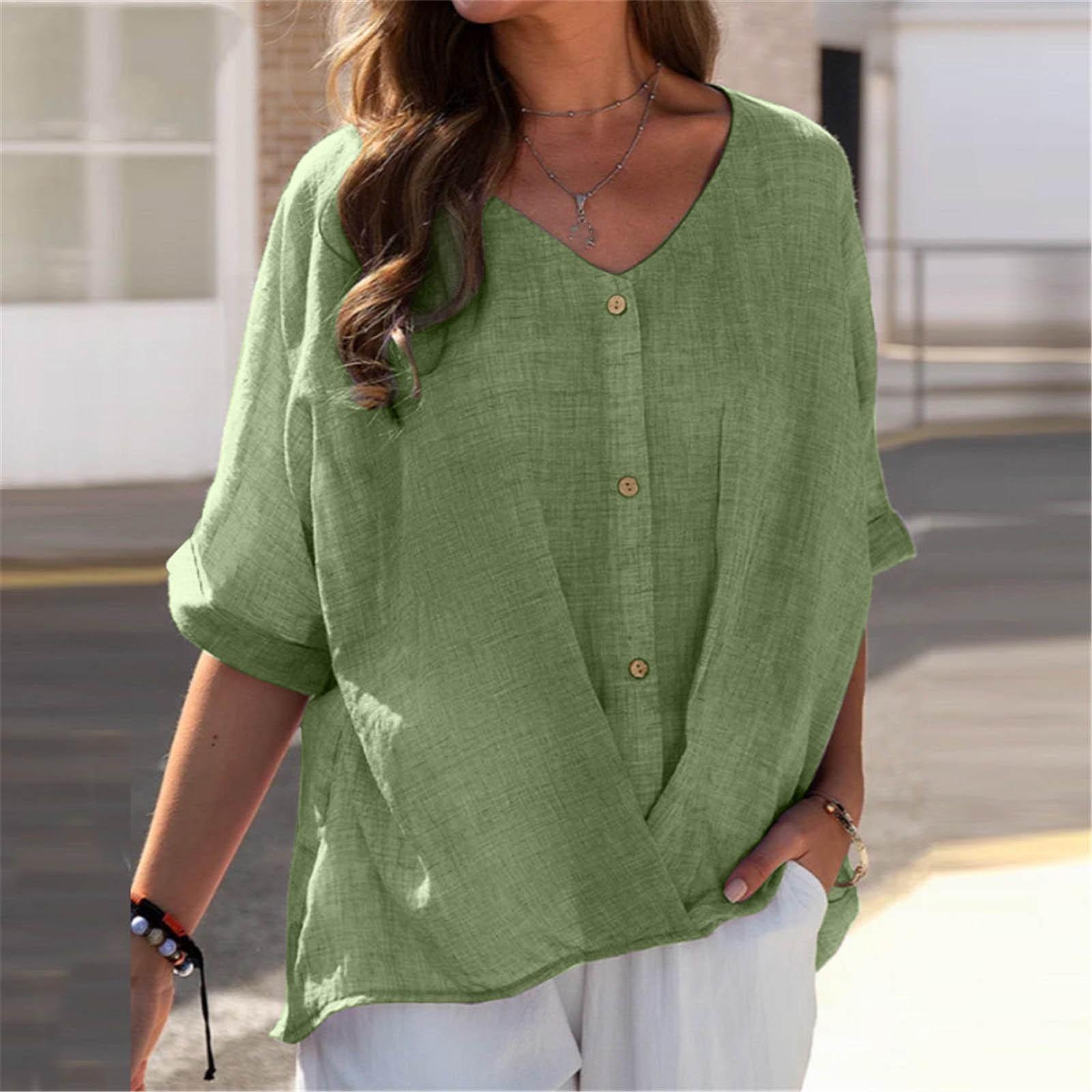 Женский однотонный пуловер с v-образным вырезом, рубашка на пуговицах с коротким рукавом, повседневный топ, легкие топы L зелёный