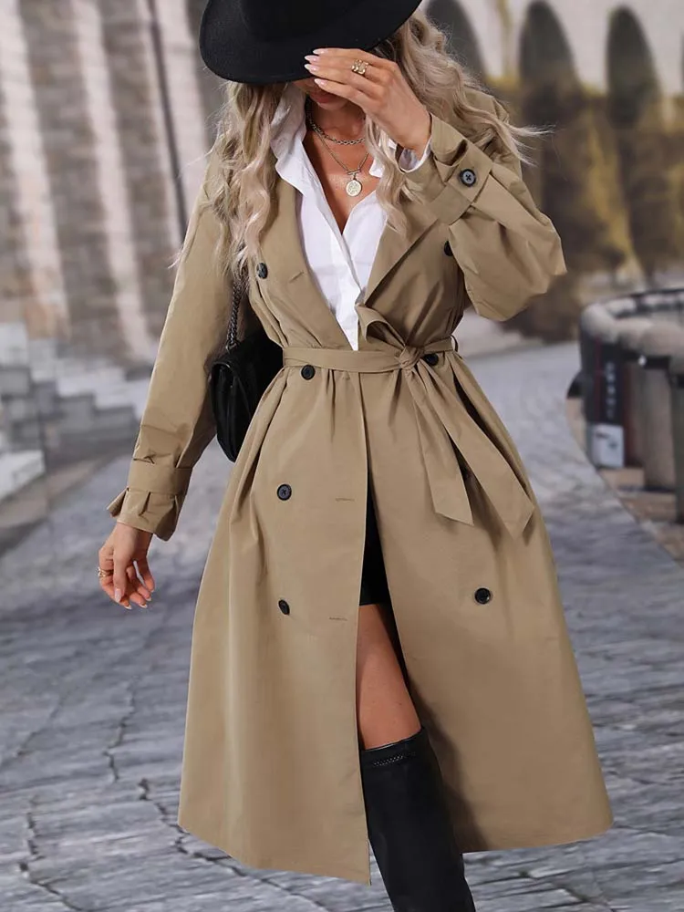 Женский осенне-зимний длинный тренч цвета хаки на пуговицах