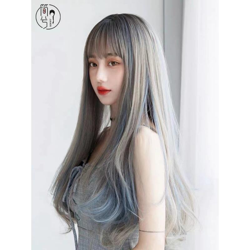 Женский парик, длинные вьющиеся волосы, длинные прямые волосы с мелированием, окрашенные волосы со висячими ушами, натуральная и реалистичная головка с цветком груши, комплект париков серый/синий