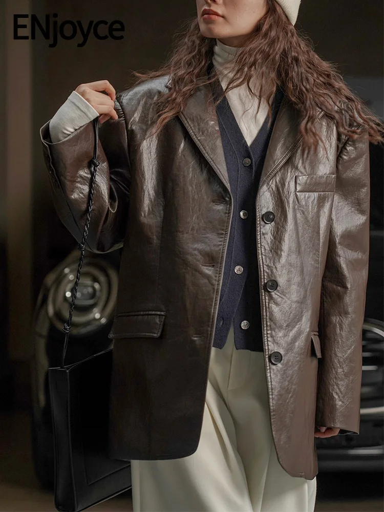 Женский пиджак с отложным воротником ENjoyce, винтажный пиджак из искусственной кожи и хлопка, теплая куртка в Корейском стиле панк, зима 2023