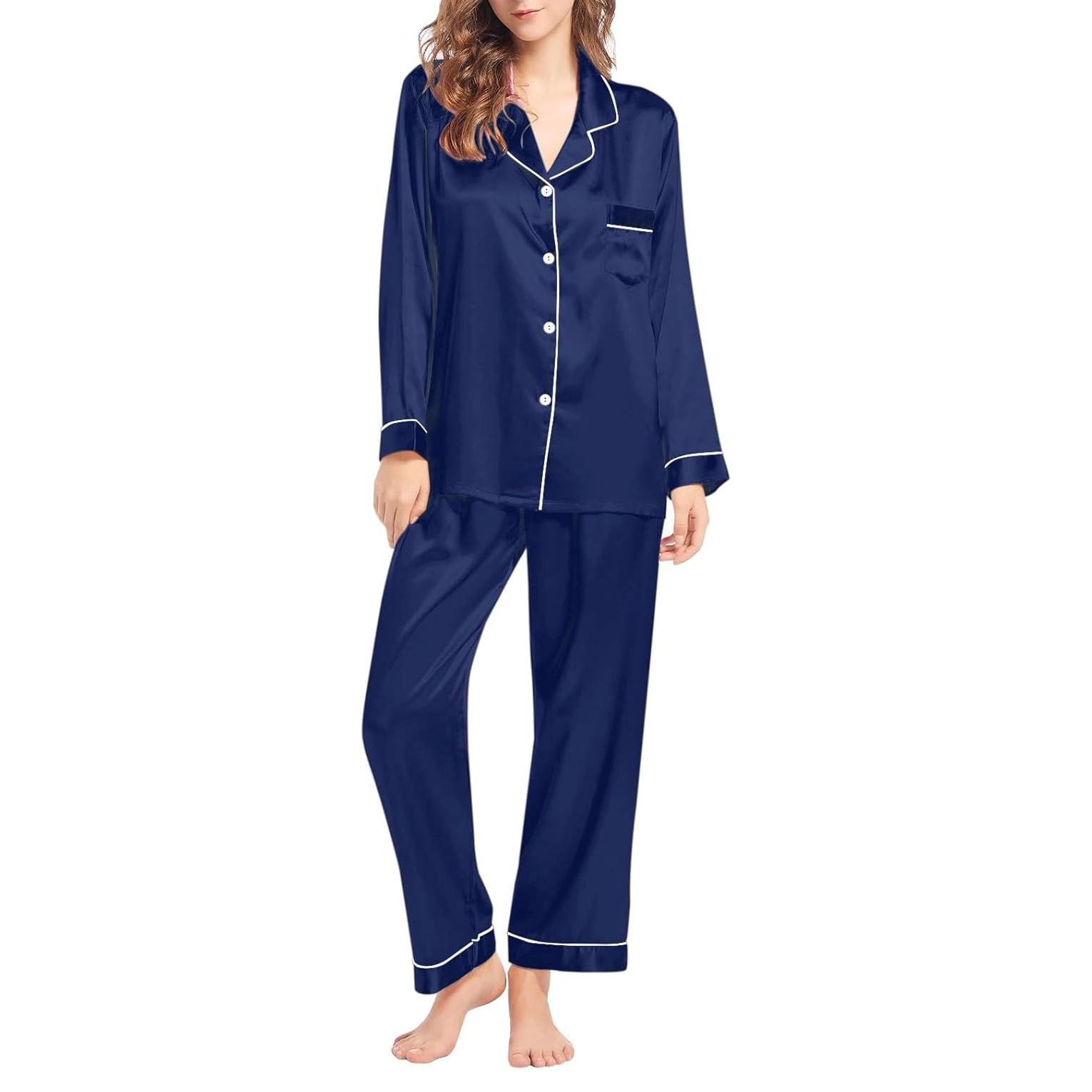 Женский пижамный комплект на пуговицах из атласного шелка, комплекты пижам с длинным рукавом и V-образным вырезом, домашняя одежда для сна M темно-синий