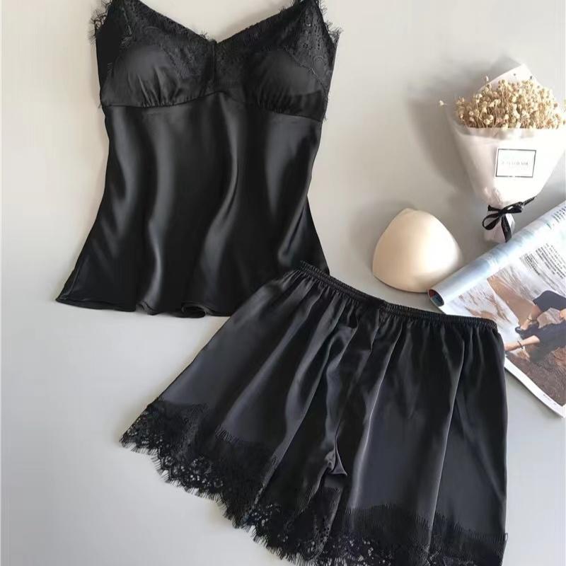 Женский пижамный костюм Модный V-образный вырез Кружево Сексуальное нижнее белье Пижама Комплект шорт для сна Новинка M чёрный