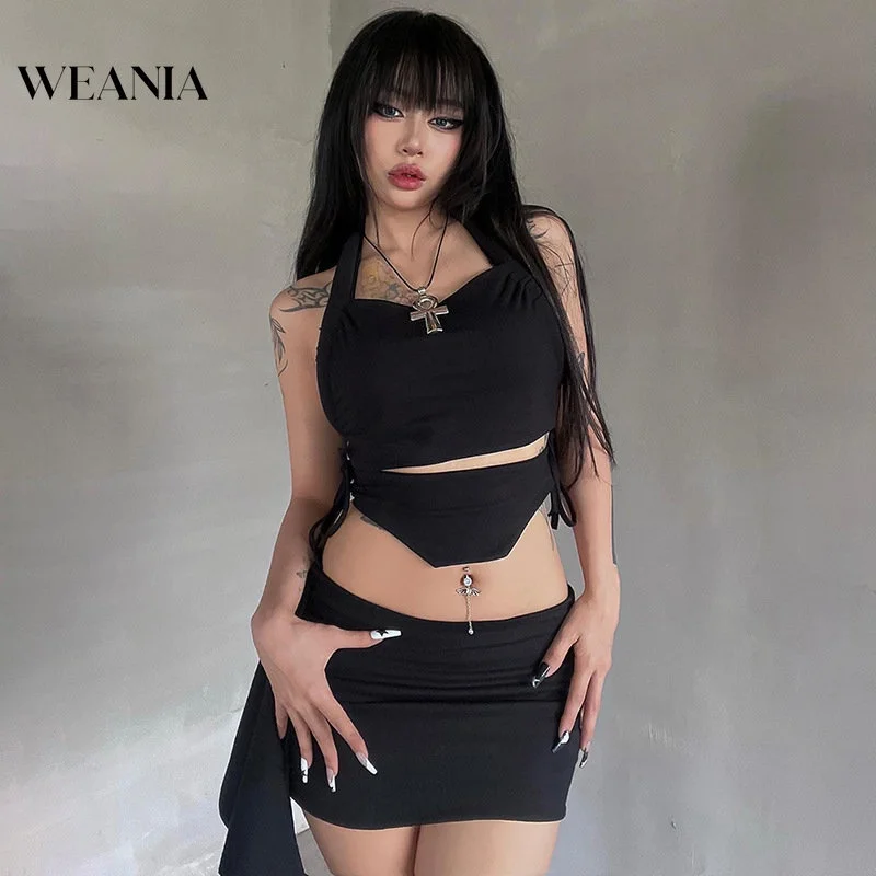 Женский пикантный жилет на бретельках с лямкой через шею и маленькая юбка комплект из двух предметов