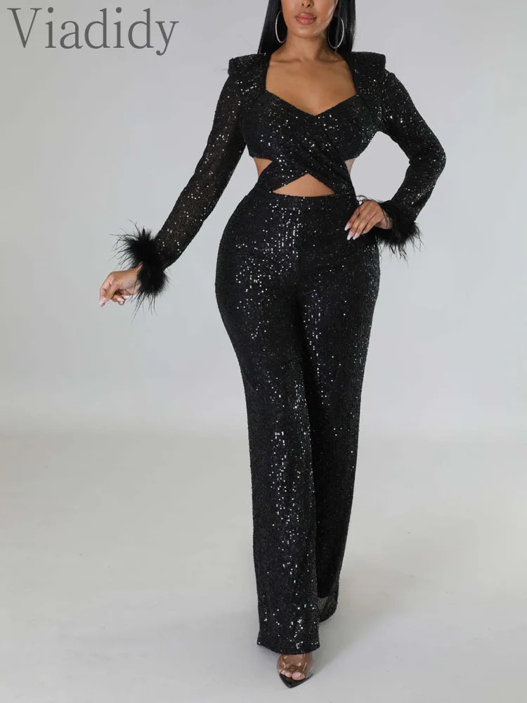 Женский пикантный однотонный комбинезон с блестками и перьями, с вырезами, с длинным рукавом, на молнии сзади