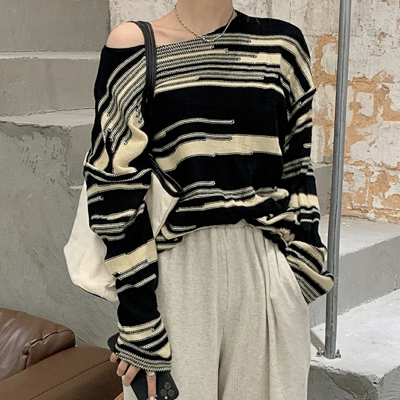 Женский полосатый корейский свободный свитер с круглым вырезом вязаная одежда Женский Тонкий Повседневный пуловер Футболка укороченный с...