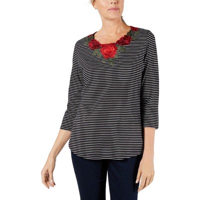 Женский пуловер-рубашка в полоску с вышивкой Karen Scott BHFO 5894, Deep black
