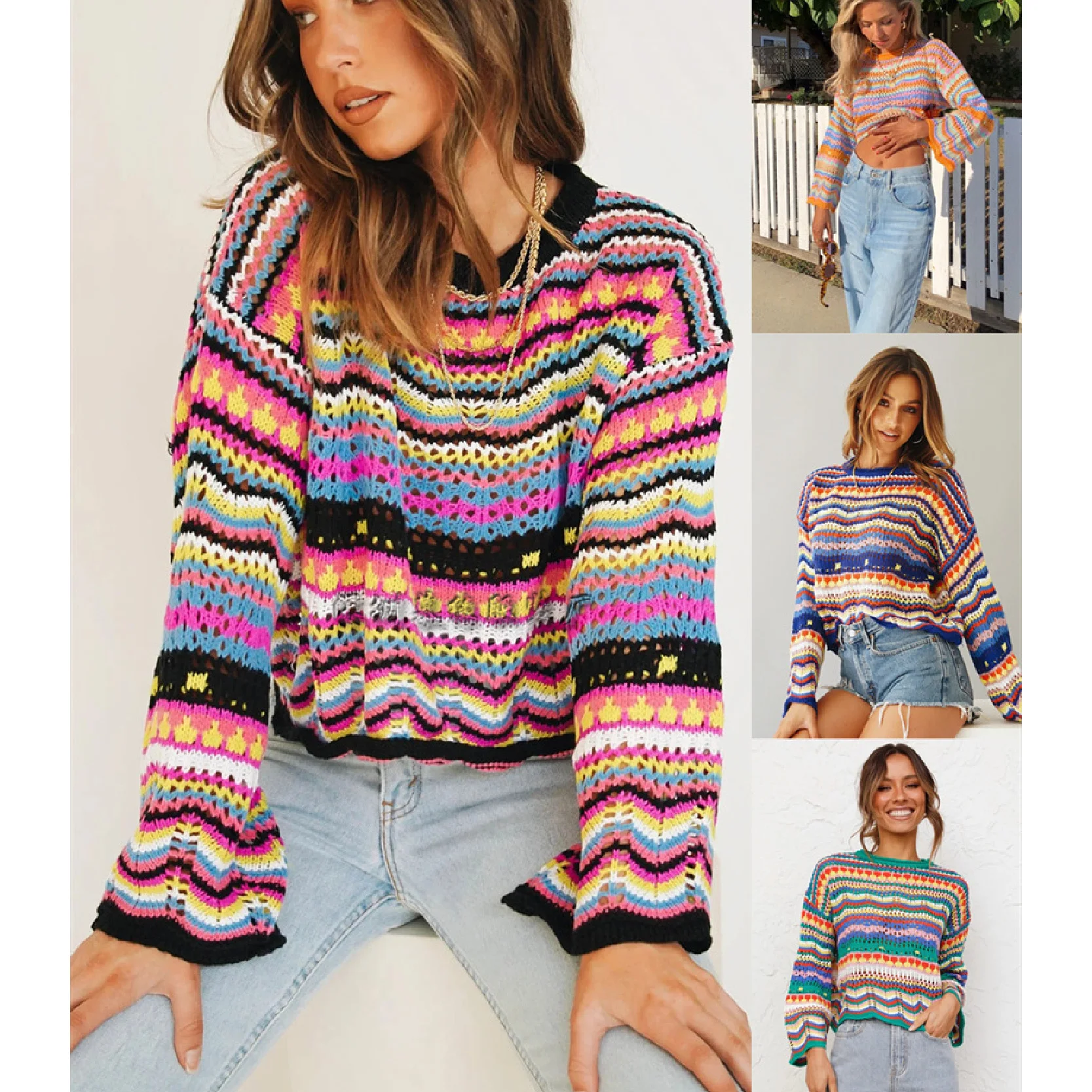 Женский пуловер, свитер в стиле ретро с вышивкой, свободный Радужный элегантный топ в полоску с круглым вырезом и уникальным дизайном