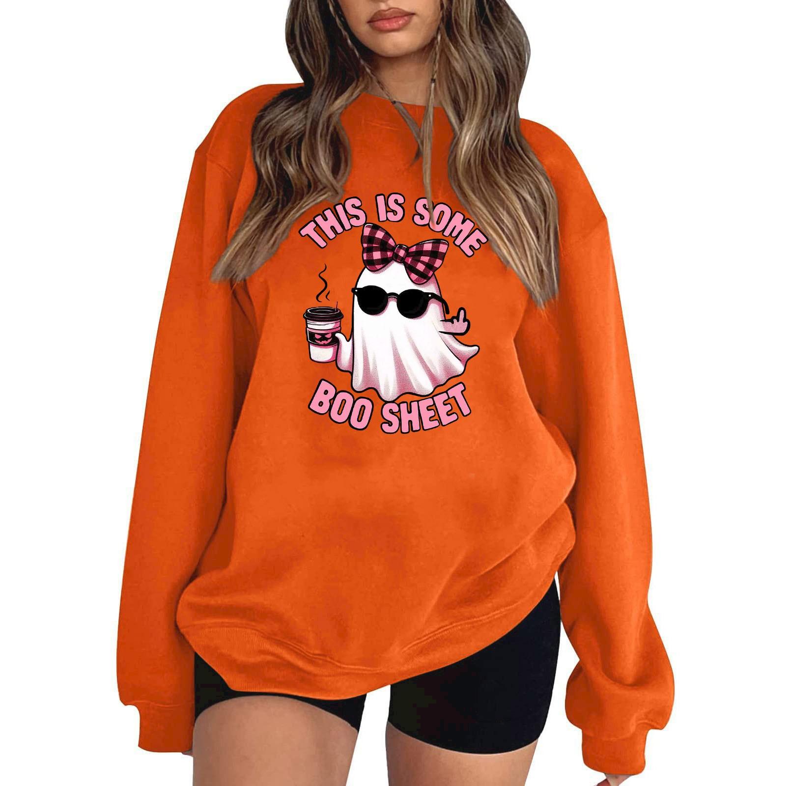 Женский пуловер с принтом Хэллоуина, круглый вырез, заниженная линия плеча, блузка с длинными рукавами S оранжевый