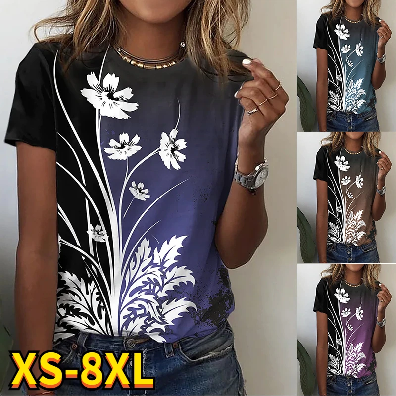 Женский пуловер с цветочным принтом, круглым вырезом и короткими рукавами