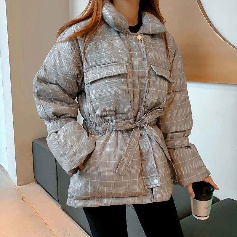 Женский пуховик в клетку, винтажный пуховик с завязками на талии и большими карманами, Осень-зима 2021