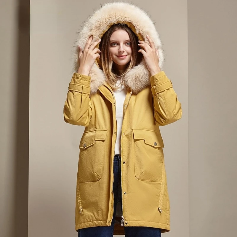 Женский пуховик средней длины, с капюшоном и воротником из лисьего меха
